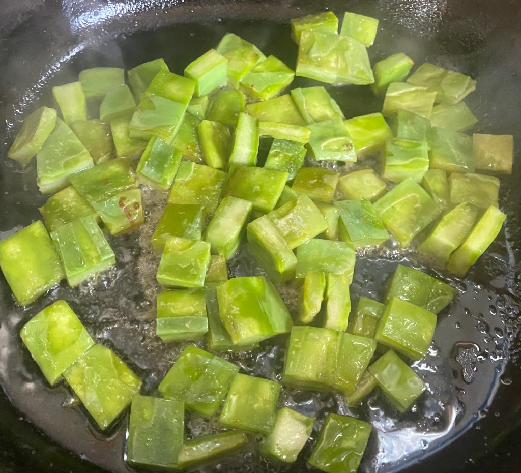 Prickly pear cactus leaves have become a favorite ingredient of mine. They taste similar to a slightly tart green bean when eaten raw, and a bit like a green bell pepper when cooked. They produce a gelatinous substance when cut, not unlike okra. Some people find this slimy texture off-putting and it can be removed by cooking, which I prefer. It sounds weird, but by boiling the cactus with the husk of a tomatillo, the gel is absorbed into the husk and there is no slime! You can also cook out the gel by sauteing, which I do when adding to eggs, etc.
