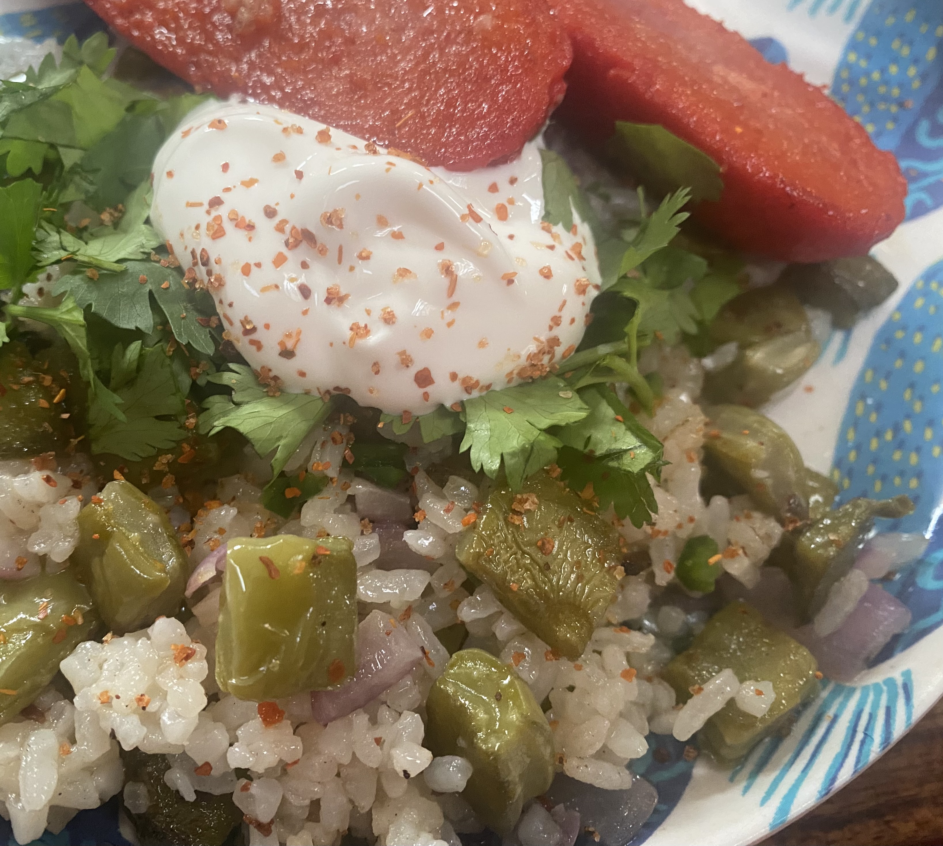 - I’m a big fan of Mexican “sour” cream. It’s called “crema” and is not as thick or as tart as American sour cream. I put a dollop of it on just about every savory meal I make, including the cactus salad!