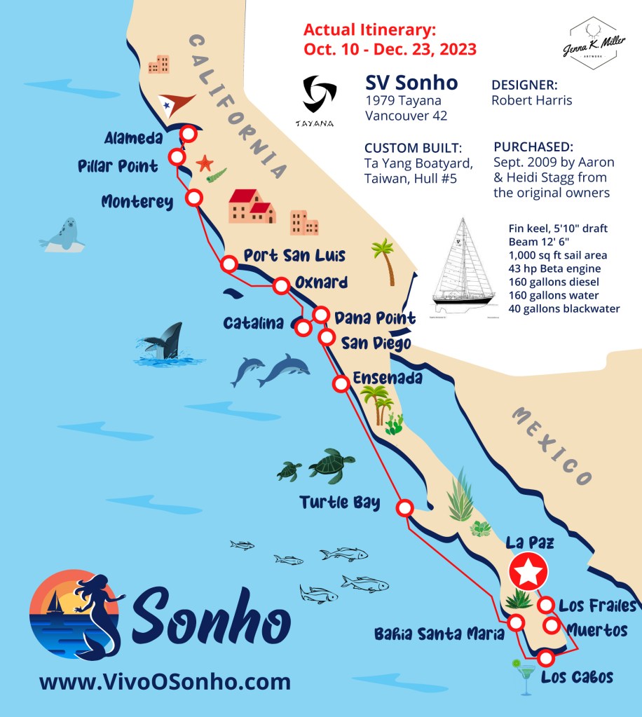Due to the late delivery of essential parts and projects taking waayy longer than expected, we ended up leaving Alameda with our hair on fire on Oct. 10, 2022, with a reduced itinerary of now entering only seven ports and staying at three yacht clubs (two of which were in San Diego). We had to add a second overnight at sea and shorten our stays in each port.