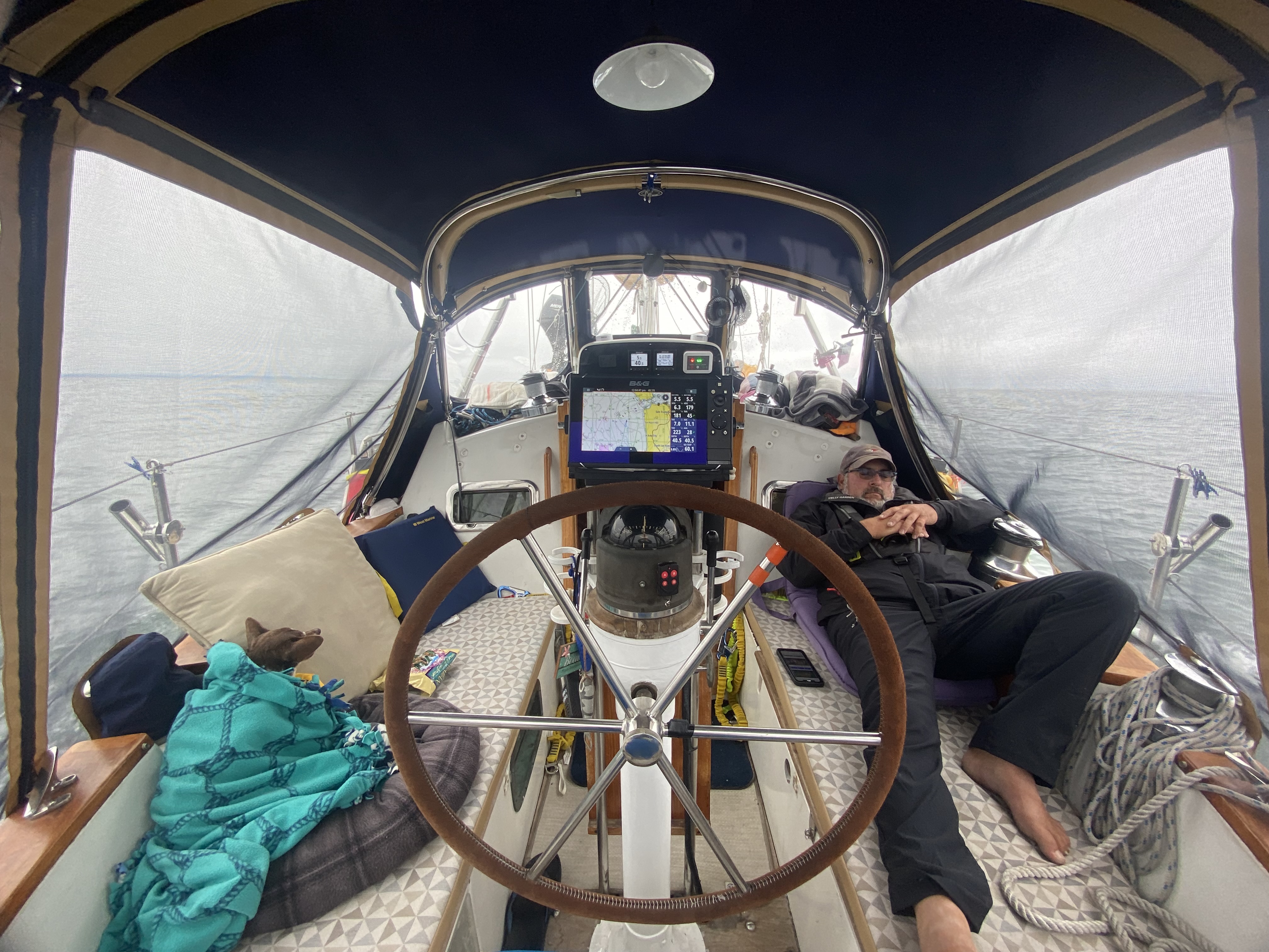 Our Scanmar auto pilot kept us perfectly on course, letting us relax and take in the ocean without standing at the helm. AIS (Automatic Identification System) is a brilliant invention that basically allows us to “see” other boats and aids to navigation, even if they are not within visibility, giving us less of a “pucker factor” as we motored in the still, gray morning light. We purposely chose to spend the extra money on the version that allows us to both receive information and transmit. This way other vessels can contact us (and vice versa) if there is any question as to course heading and possible collision.