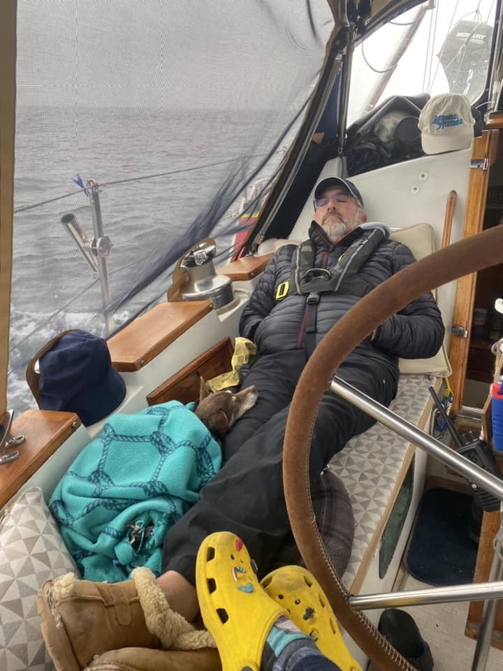 The wind never did fill in so we put the motor through the paces on the approximately 45 mile journey along the coast. We stayed about 10 miles off the shore, just outside the shipping channel and kept a vigilant eye out for the commercial fishing fleet’s crab pots. Getting one of those tangled in the prop would be an unhappy circumstance and mean that I would have to jump in to the very cold Pacific Ocean to cut it free.