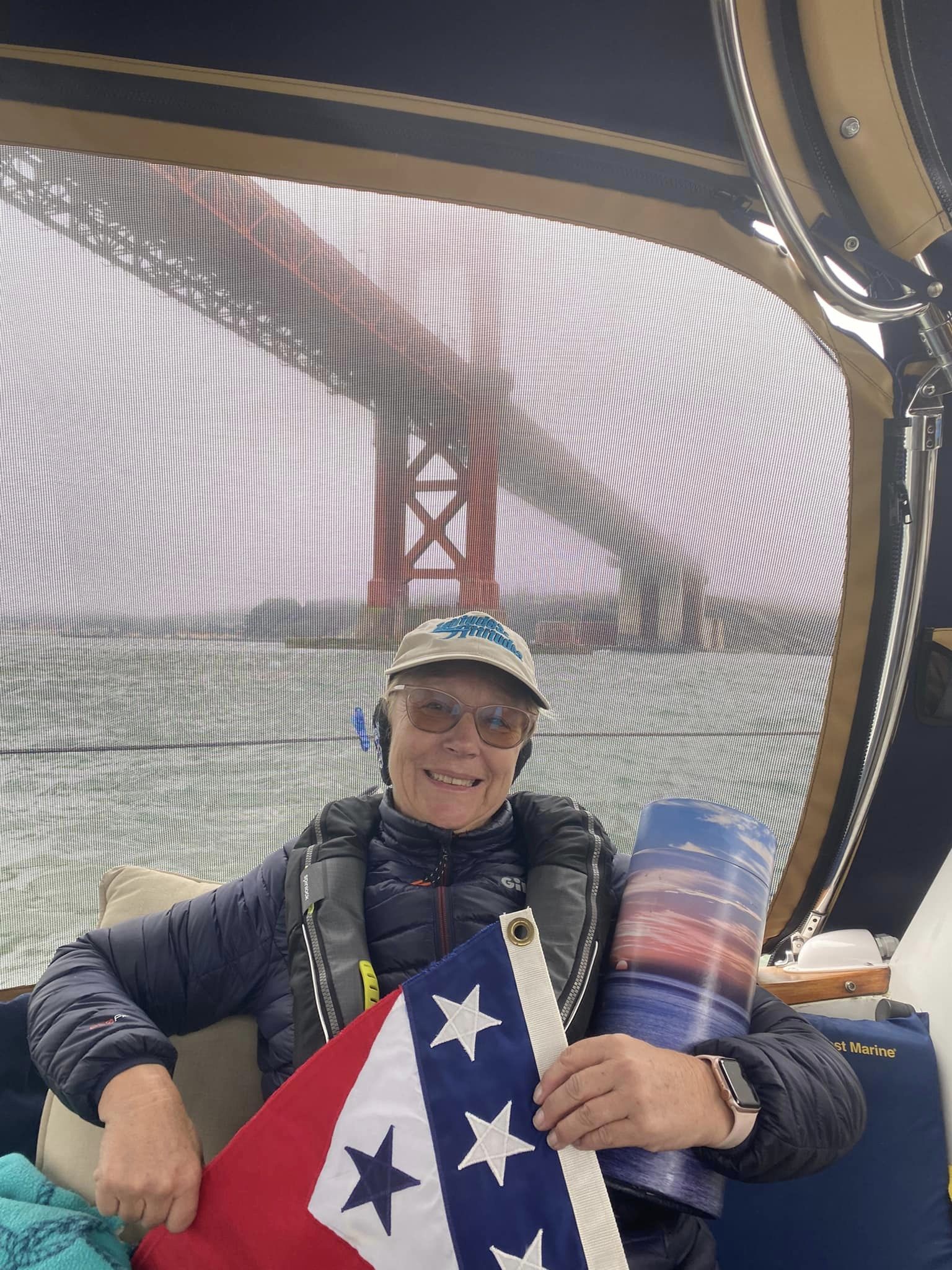 For the umpteenth time we passed the runways of the old Alameda Navy Base and the stately US Coast Guard Admiral’s house onYerba Buena Island and cruised under the City side of the Bay Bridge. San Francisco, with it’s skyscrapers and pretty waterfront, Treasure Island and Alcatraz all were left in our wake. As we slipped underneath the iconic Golden Gate Bridge, I hugged my Nana’s ashes and held my Daddy’s Staff Commodore burgee. This moment was special to us and quick phone calls were made to Aaron’s dad, Jim, and our friends Scott & Joanne, whose friendship and journey from Alameda to Mexico had kept us inspired for the final year of prep.