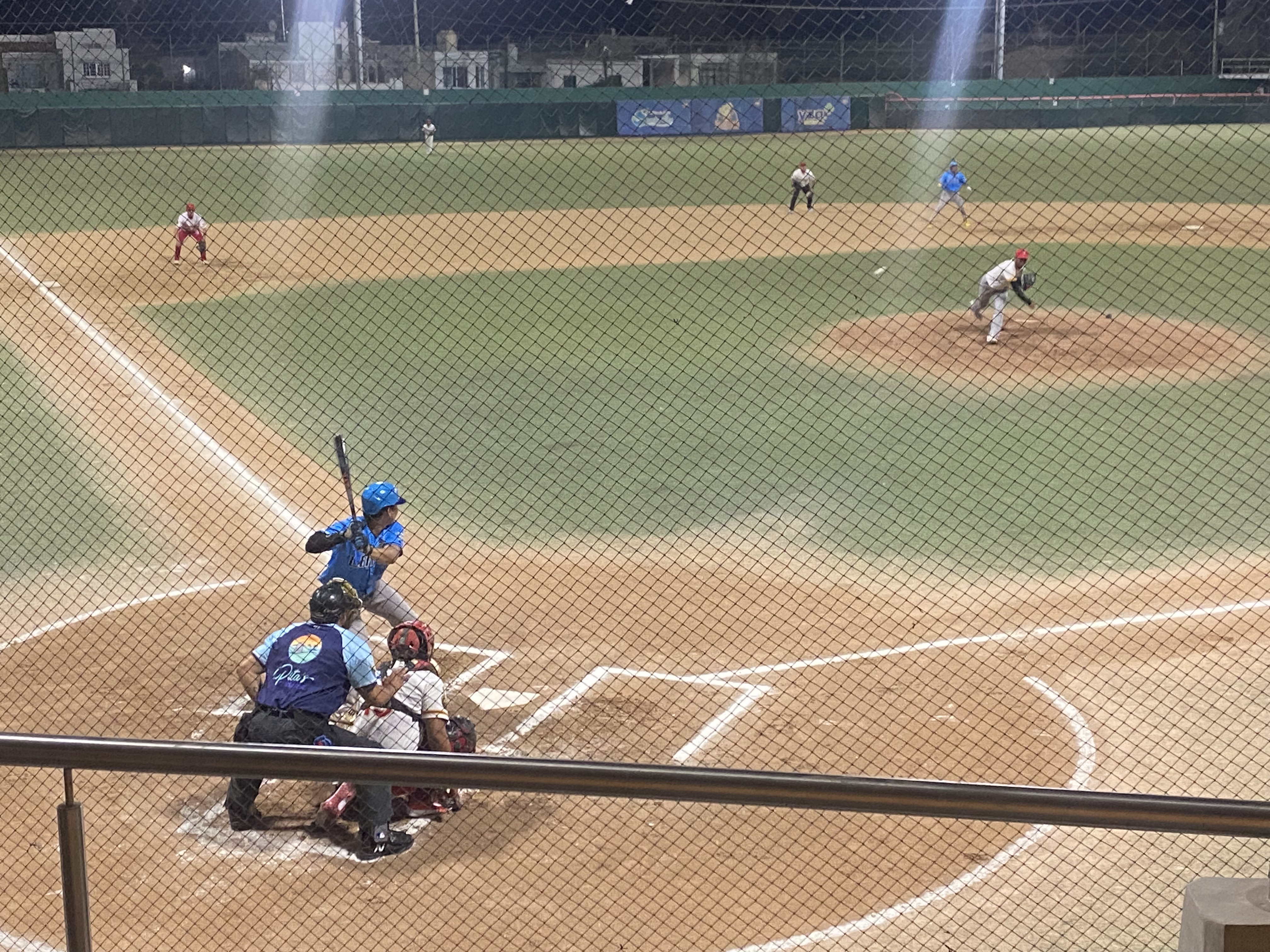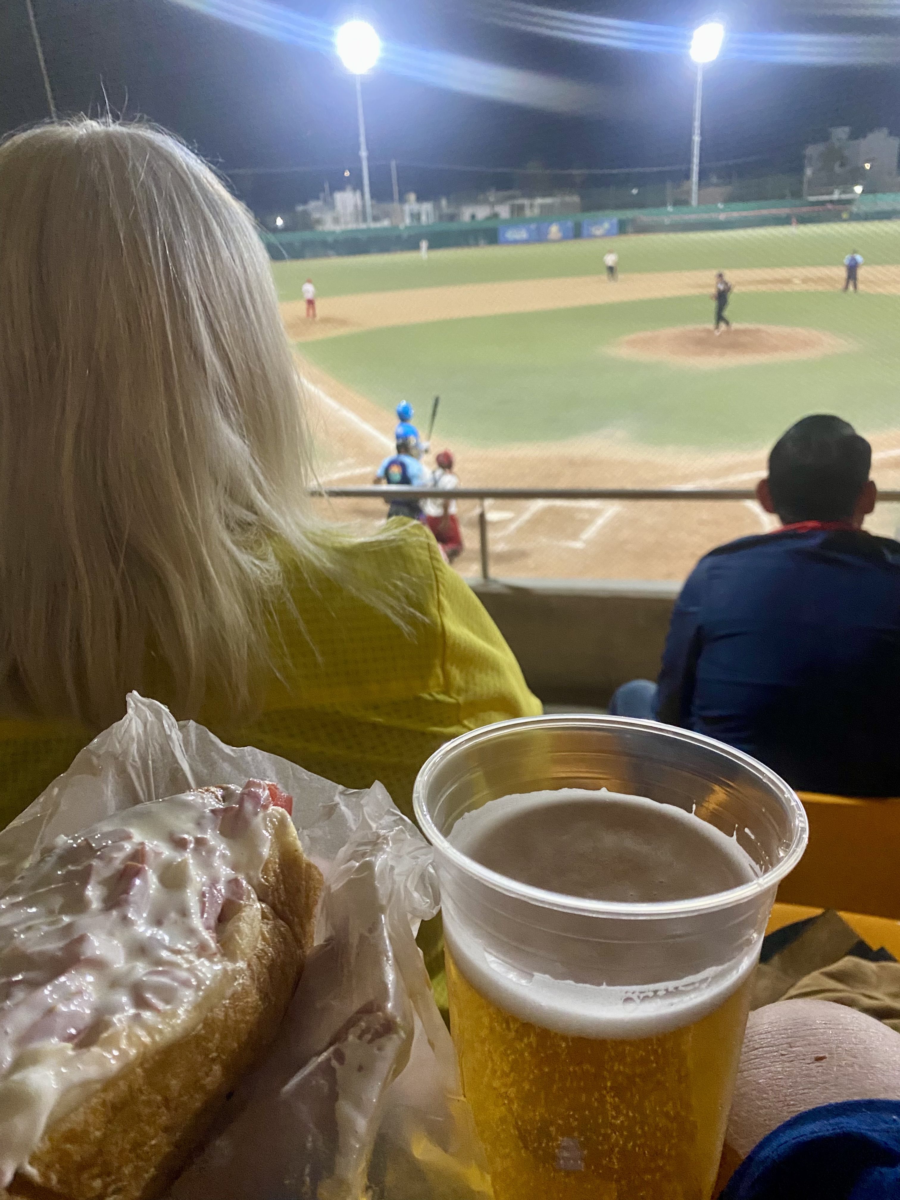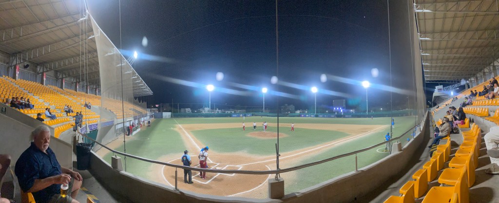 First up was buying beer. A large cup containing 24 ounces of your choice of Tecate or Pacifico cost 100 pesos ($5 USD). Seats were hard plastic anchored to cement tiers and on a first-come, non-reserved basis. Our group chose a spot directly behind home plate and, being 30 minutes early, we were among about two dozen filling the stadium at the time. (It did fill up to maybe a few hundred as the game went on.)