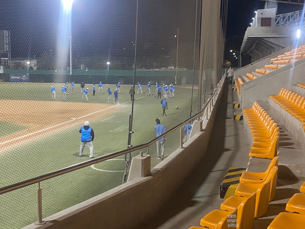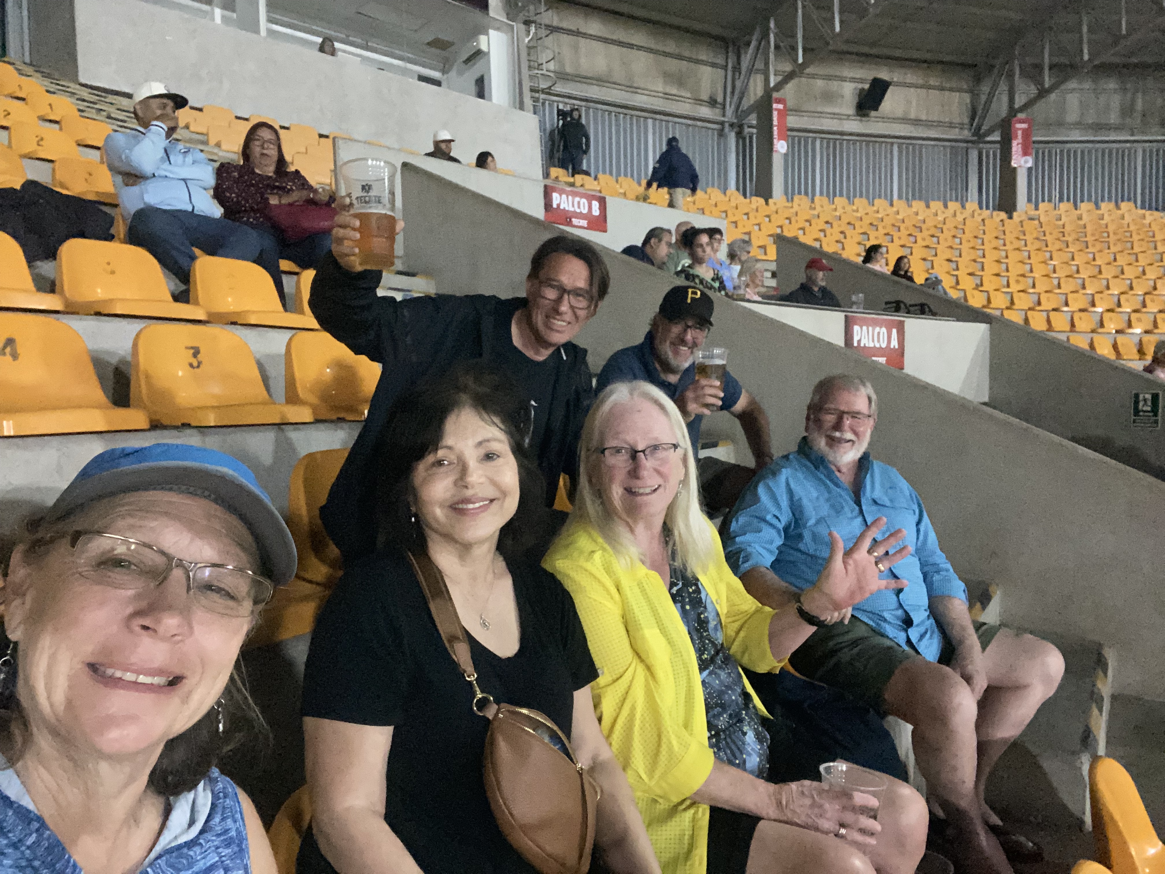 Off we went! We knew that parking might be a problem, and it being about two miles away, we decided to Didi (similar to Uber, but you can pay the driver in cash). Most ride-share cars are economy-size so it took two cars to get the six of us to the stadium. The ladies (Nina, Pat and I) went first and were dropped off at the futball (soccer) stadium next door, which also had a game that evening. As we approached the gate to the baseball stadium we saw members of the opposing team, the Toro’s, being dropped off out front and walking through the main gate carrying their gear. No special entrance for the players!