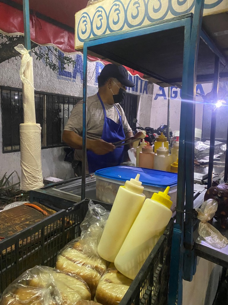 Side note: My friend owns a wholesale bakery and is the number one producer of buns for the La Paz street carts. Of course, I asked if these were Panderia Especial buns and was told, “Si!” I told them that “Mi amiga es el jefe Vicky,” and got a big smile.